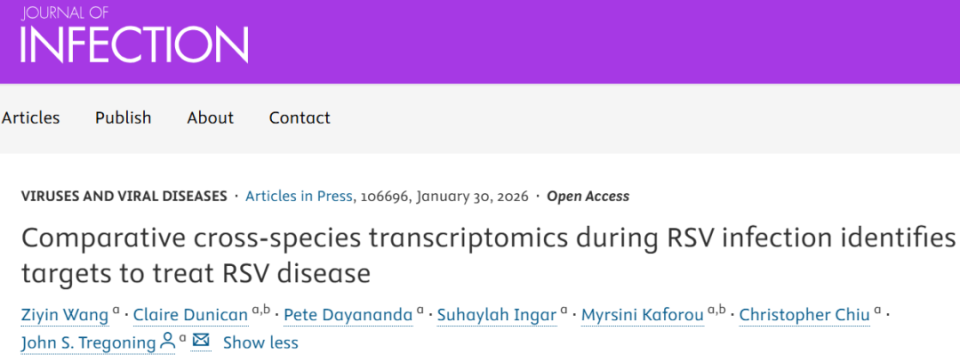 Wang Z, Dunican C, Dayananda P, et al. Comparative cross-species transcriptomics during RSV infection identifies targets to treat RSV disease. J Infect. Published online January 31, 2026. doi:10.1016/j.jinf.2026.106696