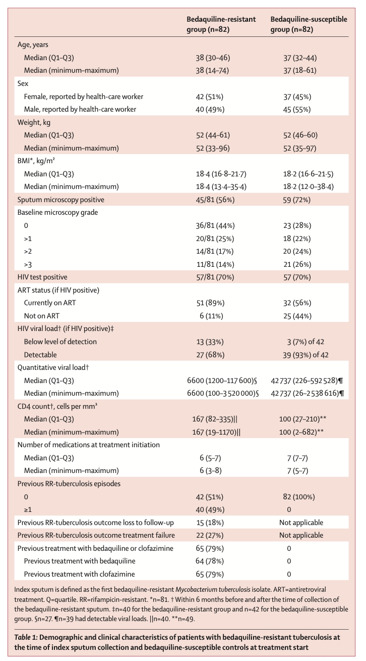 Mdlenyani L, Mohamed Z, Stadler JAM, et al. Treatment outcomes of bedaquiline-resistant tuberculosis: a retrospective and matched cohort study. Lancet Infect Dis. 2025;25(10):1149-1158. doi:10.1016/S1473-3099(25)00218-X