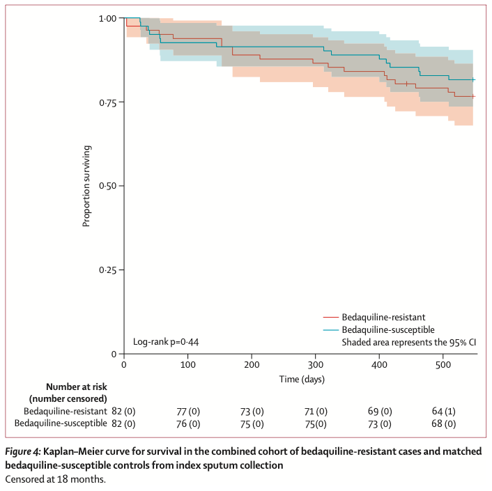 无结核病生存:在检测到贝达喹啉耐药后18个月,82例患者中仅有43例(52%)达到无结核病生存。63例存活者中,50例(79%)仍在接受治疗。18个月累计死亡率为23%(19/82)。