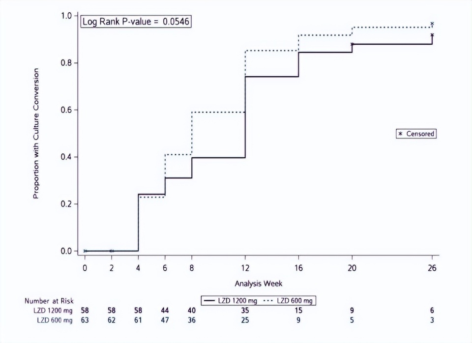 两组耐受性相当,痰培养转阴率高,但高剂量LZD组转阴速度较慢,治疗结局较差,可能与更高停药率和更差的基线疾病特征有关。
